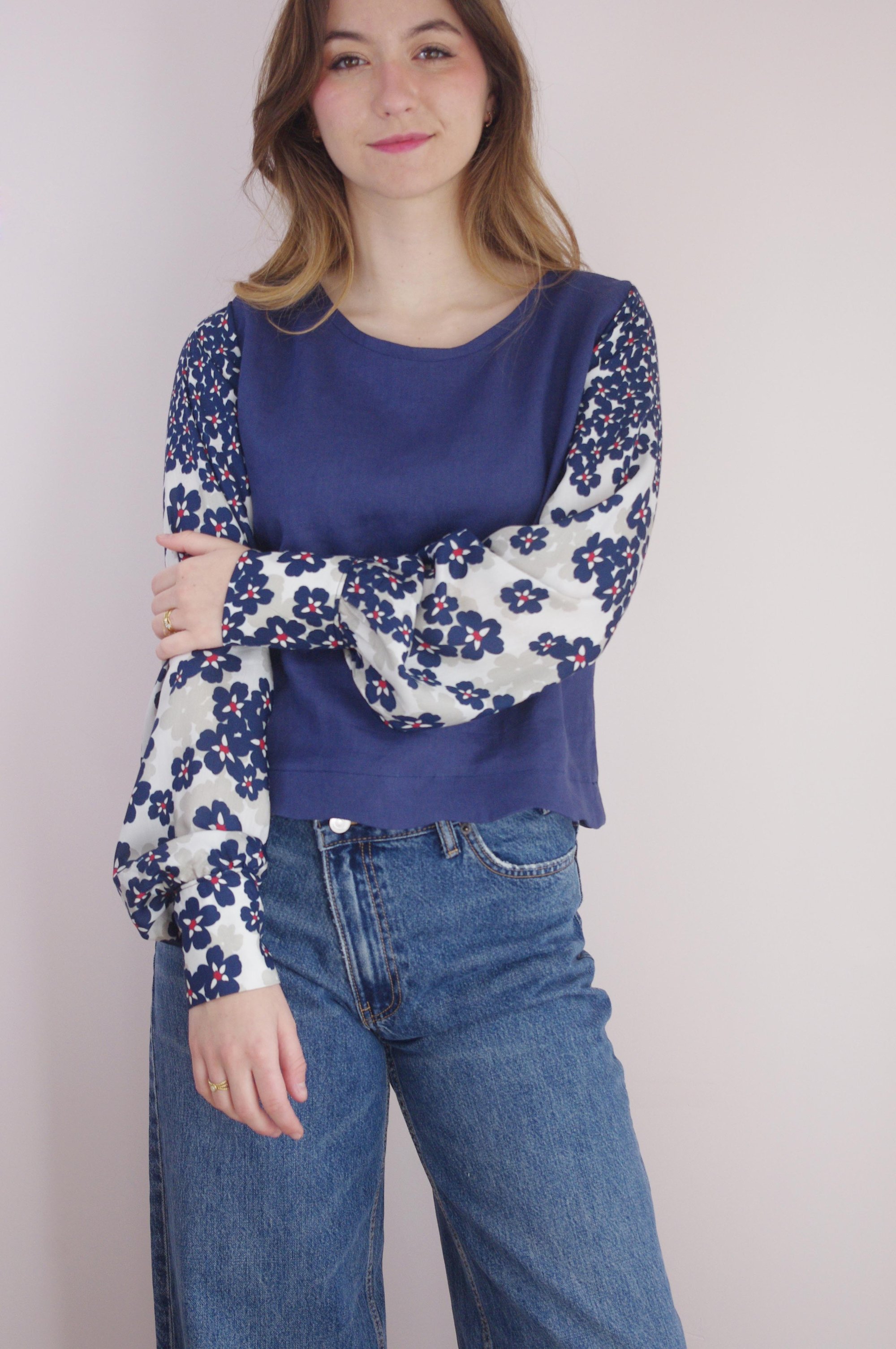 On aime son bleu profond, facile à porter, associé à des manches en voile de coton fleuri qui apportent légèreté et mouvement. Le contraste de matières donne à la pièce tout son charme, entre simplicité et détail délicat.