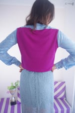 Le corps est coupé dans un beau mélange de coton et lin violet lumineux, les manches et l’empiècement haut en tissu bleu ciel ajoutent du relief, du contraste et une touche graphique.